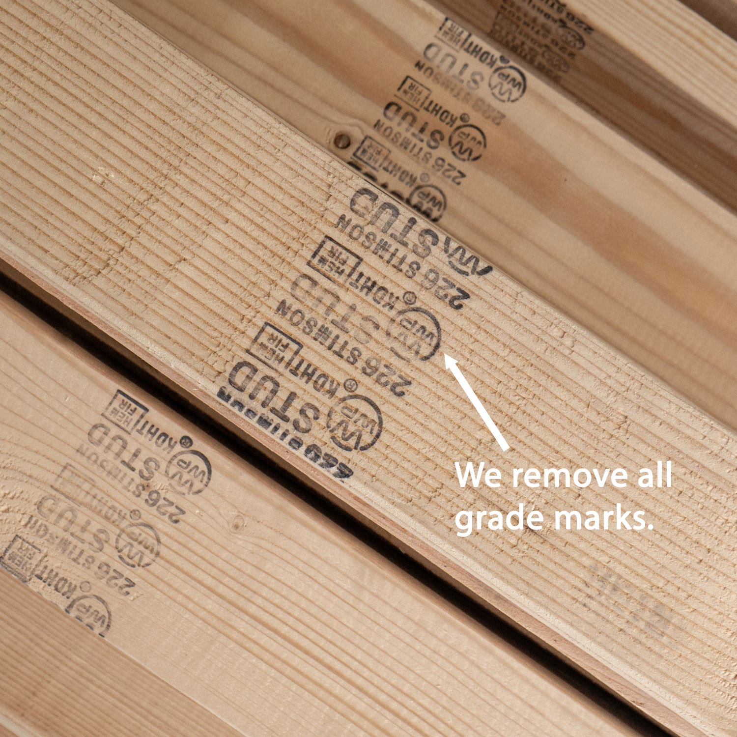 When lumber is processed at the mill, they stamp a “grade mark” several times on each board they produce. These are unsightly and most rack builders don’t take the time to remove them. TUFF Tote Rack removes all grading marks.
